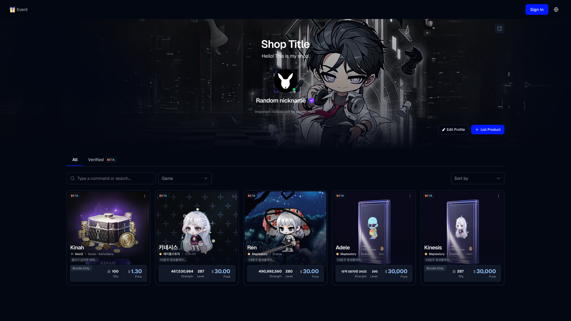 It supports both standard listings and verified listings, where verified accounts pull character data via publisher APIs and convert verified identity into NFT-backed assets.